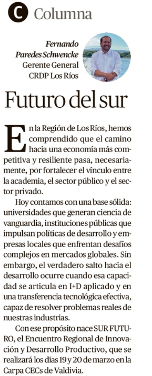 Inicio / Noticias / Futuro de Sur; Opinión de... Futuro de Sur; Opinión de Fernando Paredes en Diario Austral 9 marzo, 2026 Artículo siguiente Sur Futuro: el encuentro que posiciona a Los Ríos como nodo de innovación y desarrollo