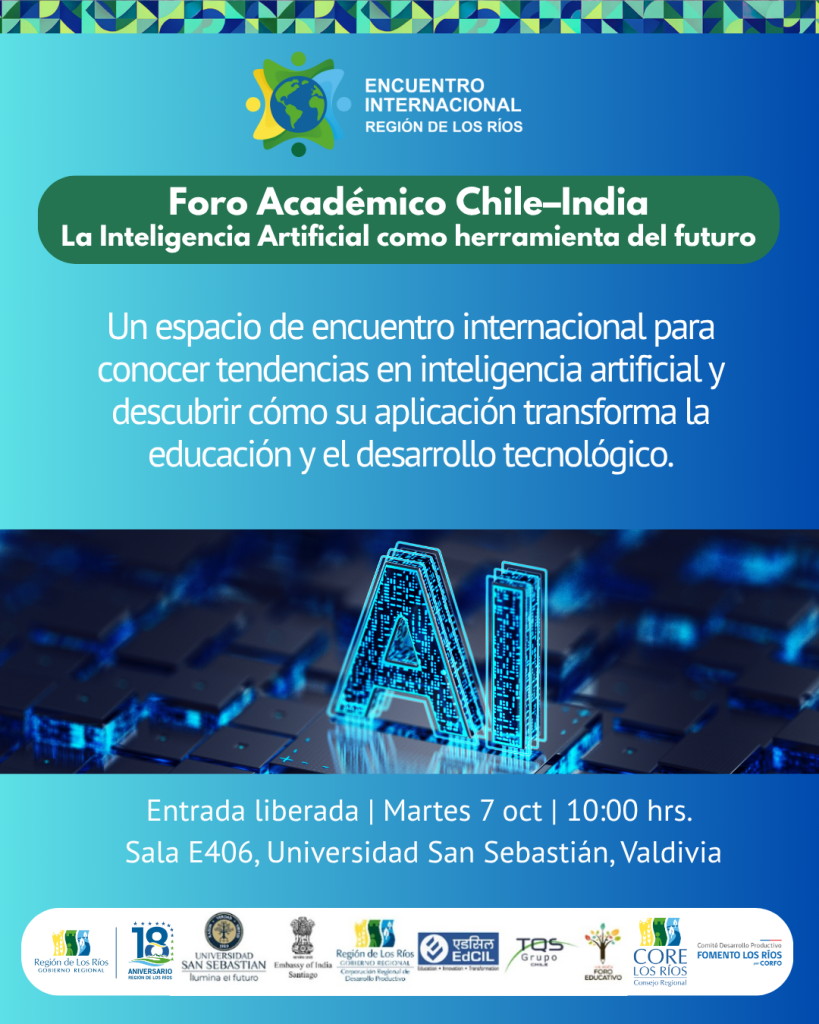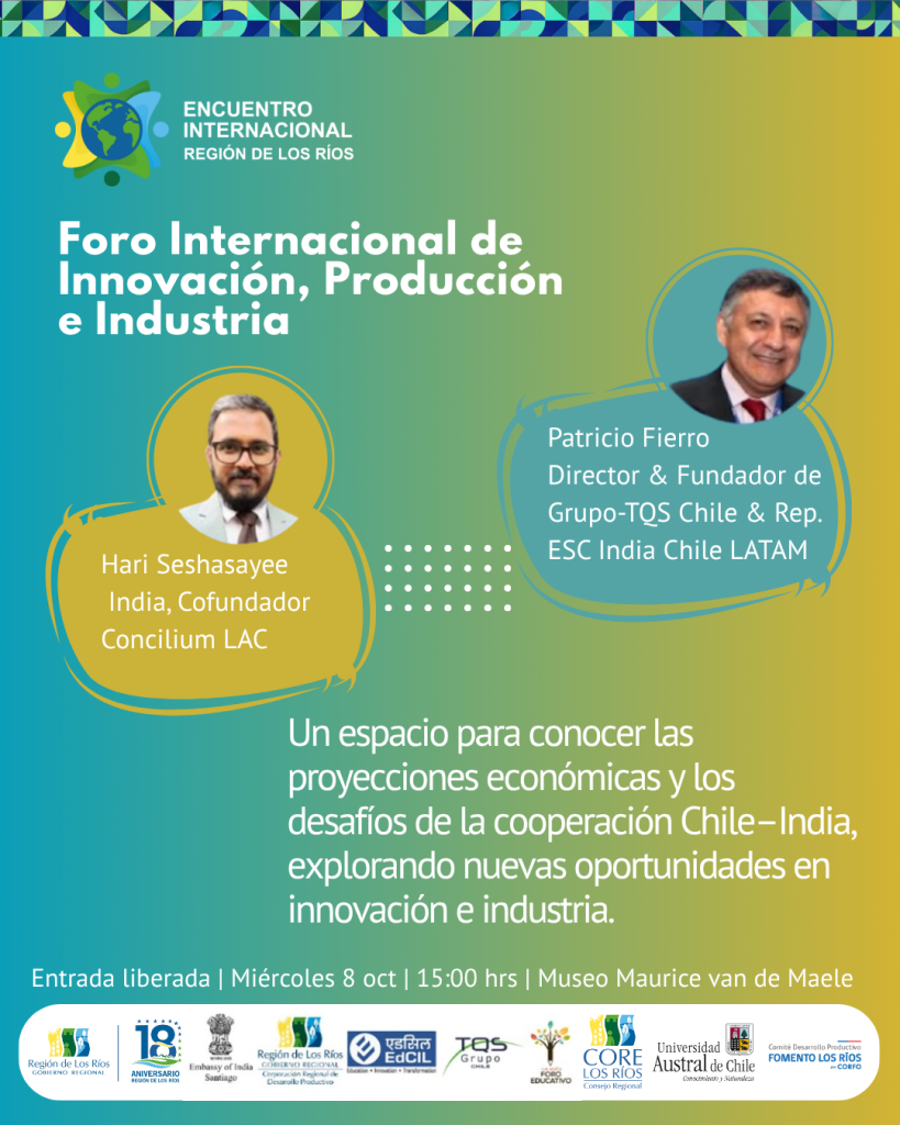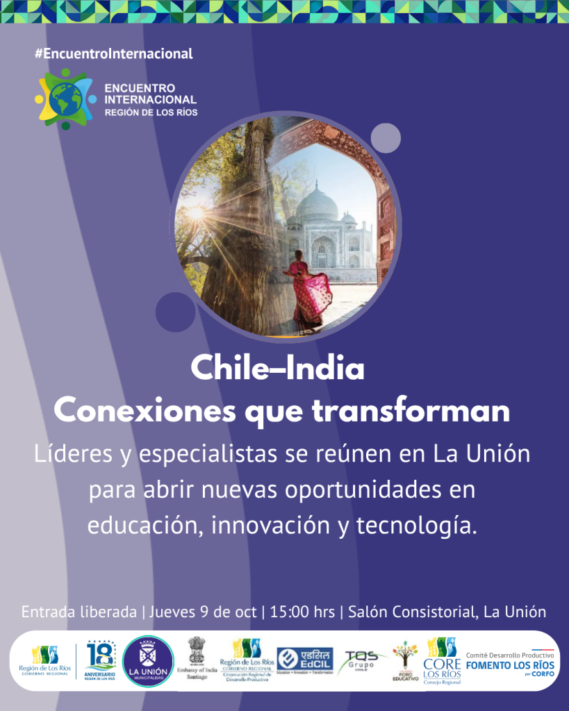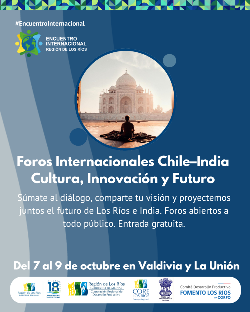 En el marco del IV Encuentro Internacional, abrimos una semana de intercambio entre Los Ríos e India para proyectar oportunidades en cultura, educación, innovación y tecnología. Son foros abiertos al público y gratuitos, con cupo limitado e inscripción previa.