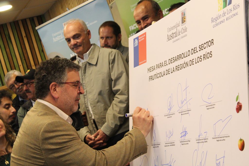 La firma protocolar contó con una nutrida representación del ecosistema regional: desde nuestra Corporación, el gerente general Fernando Paredes, en compañía de representantes del Gobierno Regional de Los Ríos, facultades de la UACh, INDAP, SAG, INIA, CNR, CORFO Los Ríos, gremios, cooperativas, agrupaciones productivas, empresas y asesores técnicos vinculados a la fruticultura.