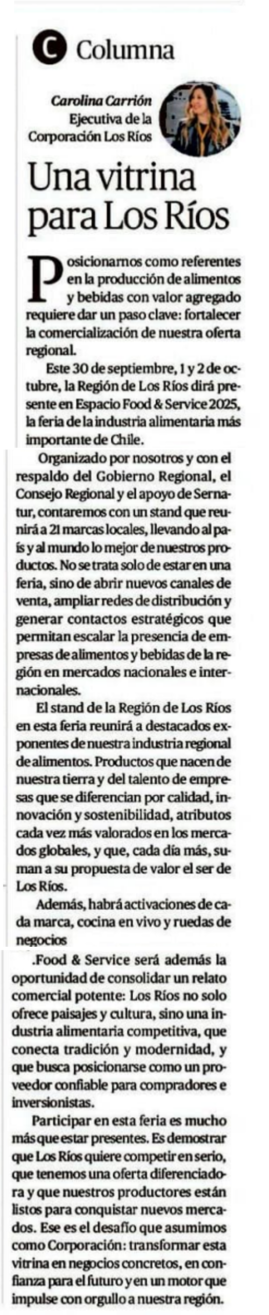 Inicio / Noticias / Una Vitrina para Los Ríos.... Una Vitrina para Los Ríos. Opinión de Carolina Carrión en Diario Austral 30 septiembre, 2025 Etiquetas Columna Columna de opinión Artículo anterior Proyectando Los Ríos al mundo: entrevista con Juan Taladriz Artículo siguiente Los Ríos Regenerativo: sembrando hoy el mañana de la región