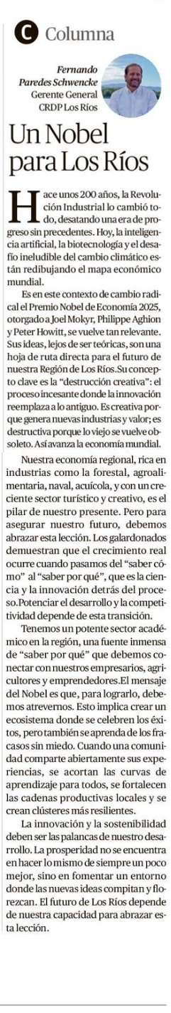 Inicio / Noticias / Un Nobel para Los Ríos.... Un Nobel para Los Ríos. Opinión de Fernando Paredes en Diario Austral 21 octubre, 2025 Etiquetas Columna Columna de opinión Artículo siguiente Futrono y Mariquina se suman a la conversación sobre la Marca Región de Los Ríos